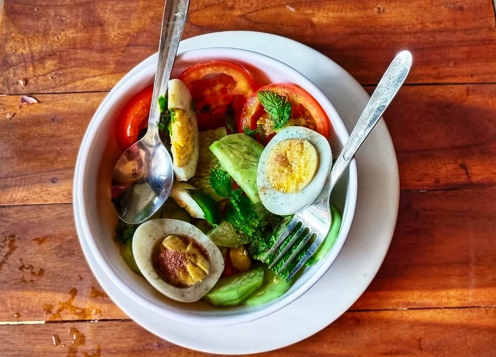 একটি বড় বাটিতে সব উপকরণ একসঙ্গে মিশিয়ে নিলেই তৈরি বয়েলড এগ স্যালাড।