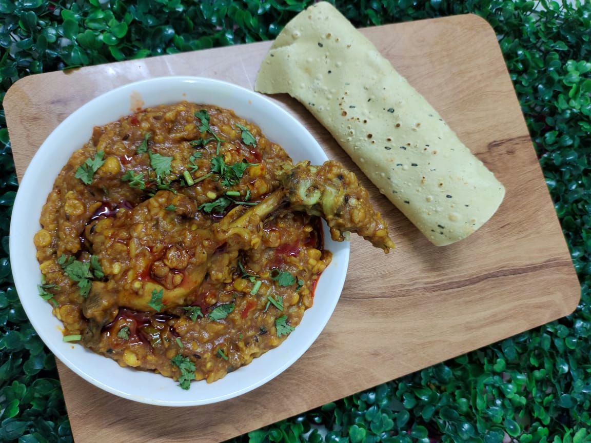 ২০০ গ্রাম গোবিন্দ চাল, ৫০ গ্রাম গোটা মুসুর ডাল, ৫০ গ্রাম মুগডাল, ৫০ গ্রাম ছোলার ডাল, ৪ টেবিল চামচ সর্ষের তেল, ২ টেবিল চামচ ঘি, ১ টা তেজপাতা, ২ টুকরো দারচিনি, ৪-৫ টা এলাচ, ৩ টে শুকনো লঙ্কা, ৪ টে লবঙ্গ, ১ চা চামচ গোটা জিরা, ১ চা গোটা ধনে, ২ টো বড় মাপের মিহি করে কাটা পেঁয়াজ, ১ চা চামচ আদা বাটা, ২ চা চামচ রসুন বাটা, ৭৫০ গ্রাম হাড় সমেত মুরগির মাংস, ৩ টেবিল চামচ ফেটানো টকদই, ২ চা চামচ জিরা গুঁড়ো, ১ চা চামচ লঙ্কা গুঁড়ো, ১ চা চামচ হলুদ গুঁড়ো, ১ চা চামচ ধনে গুঁড়ো, নুন পরিমান মতো, ৩ কাপ গরম জল, ধনে পাতা, ৪-৫ টা কাঁচা লঙ্কা, ১ টেবিল চামচ চিনি, আধ টেবিল চামচ গরম মশলা গুঁড়ো, অল্প হিং, ১ চা চামচ রসুন কুচি, ১ চা চামচ লম্বা ও সরু করে কাটা আদা, ১ চা চামচ কাশ্মীরি লঙ্কার গুঁড়ো